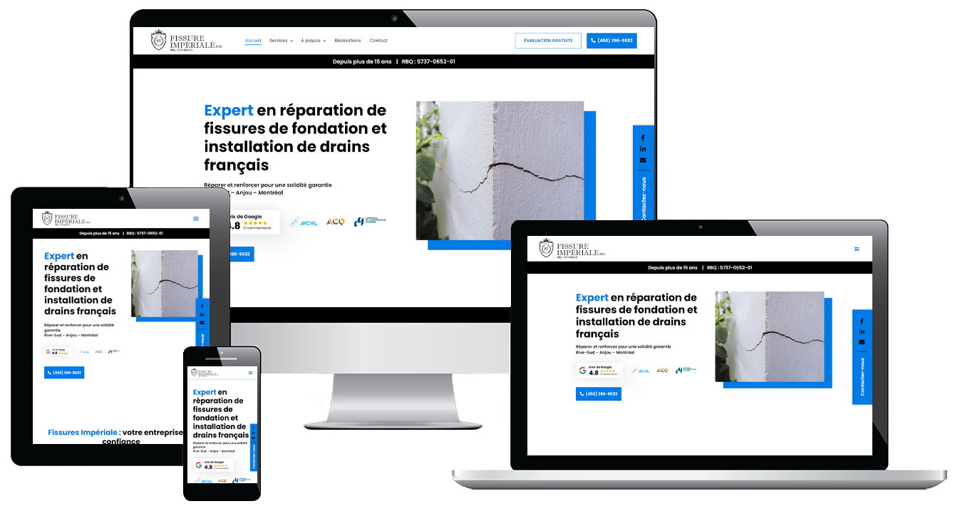Fissure Impériale, with over 15 years of experience, focuses on repairing foundation cracks and protecting homes from water infiltration, humidity, and structural issues. The template is tailored to highlight the company’s expertise and dedication to preserving the integrity and safety of residential properties.