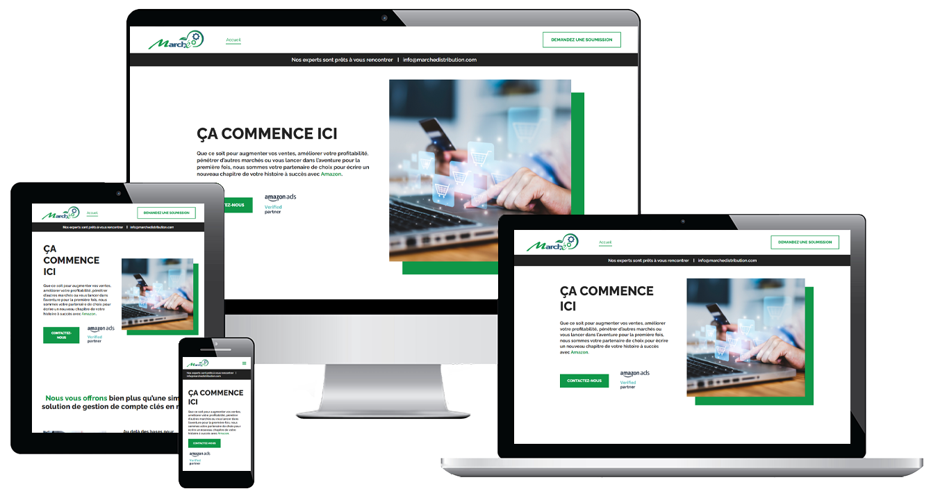 The landing page is crafted to highlight their expertise and dedication in guiding businesses through the complexities of the Amazon marketplace. With a focus on driving growth and success, Marche Distribution aims to collaborate with clients to write new chapters in their success stories, leveraging Amazon’s vast potential.
